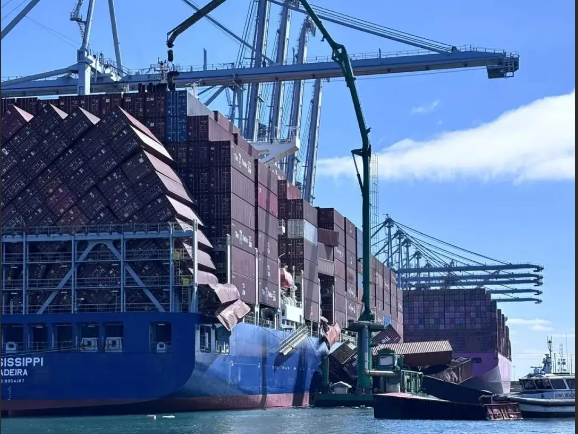 停靠过盐田港的以星航运旗下一艘船名为MISSISSIPPI (IMO 9954187)的大型集装箱船“密西西比”号,9月9日上午在洛杉矶港靠港卸船作业时,发生严重集装箱堆垛倒塌事件,有75个集装箱坠海。最新消息,救援队伍已成功从“密西西比”号货轮周边水域打捞出54个集装箱,“密西西比”号货轮上未受影响的集装箱正在被卸载。