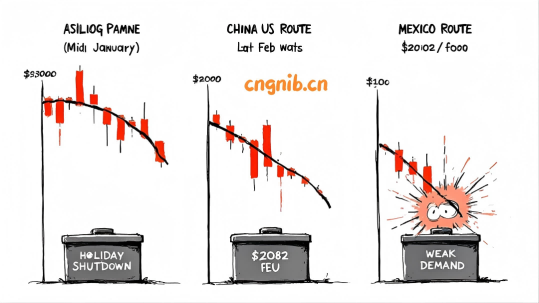 太平洋航线也出现了类似情况,至美国西海岸的即期运价已跌至每40英尺集装箱2082美元,船公司将把低运价维持到2月底。